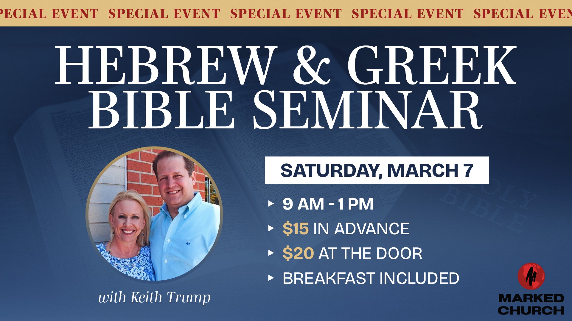 Marked Church invites you to a special Hebrew and Greek Bible Seminar on Saturday, March 7 from 9 AM to 1 PM, designed to deepen your understanding of Scripture through its original languages. Led by Keith Trump, this enriching seminar will provide practical insight into the meaning, context, and richness of the biblical text, helping you engage God’s Word with greater clarity and confidence. Whether you are a student of the Bible, a ministry leader, or simply hungry to grow, this focused time of teaching will equip you to study Scripture more effectively and accurately. Registration is $15 in advance or $20 at the door, and breakfast is included. Join us for this unique learning experience as we explore the foundations of Hebrew and Greek and strengthen our grasp of God’s Word together.